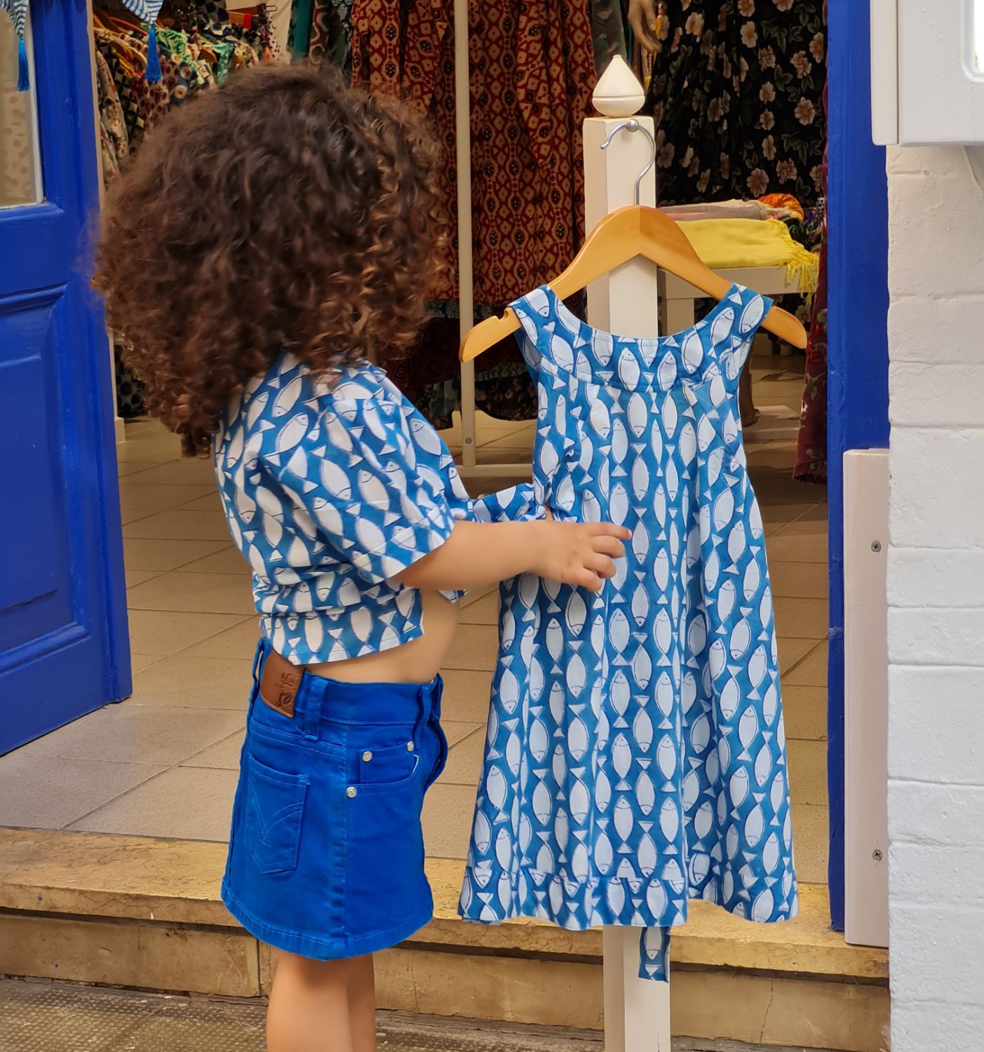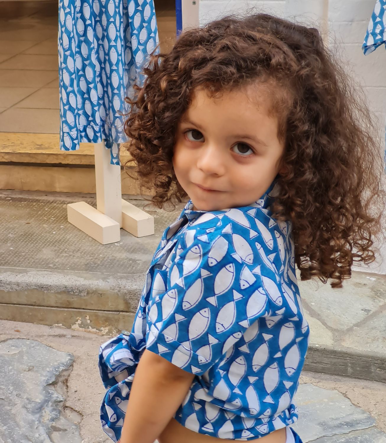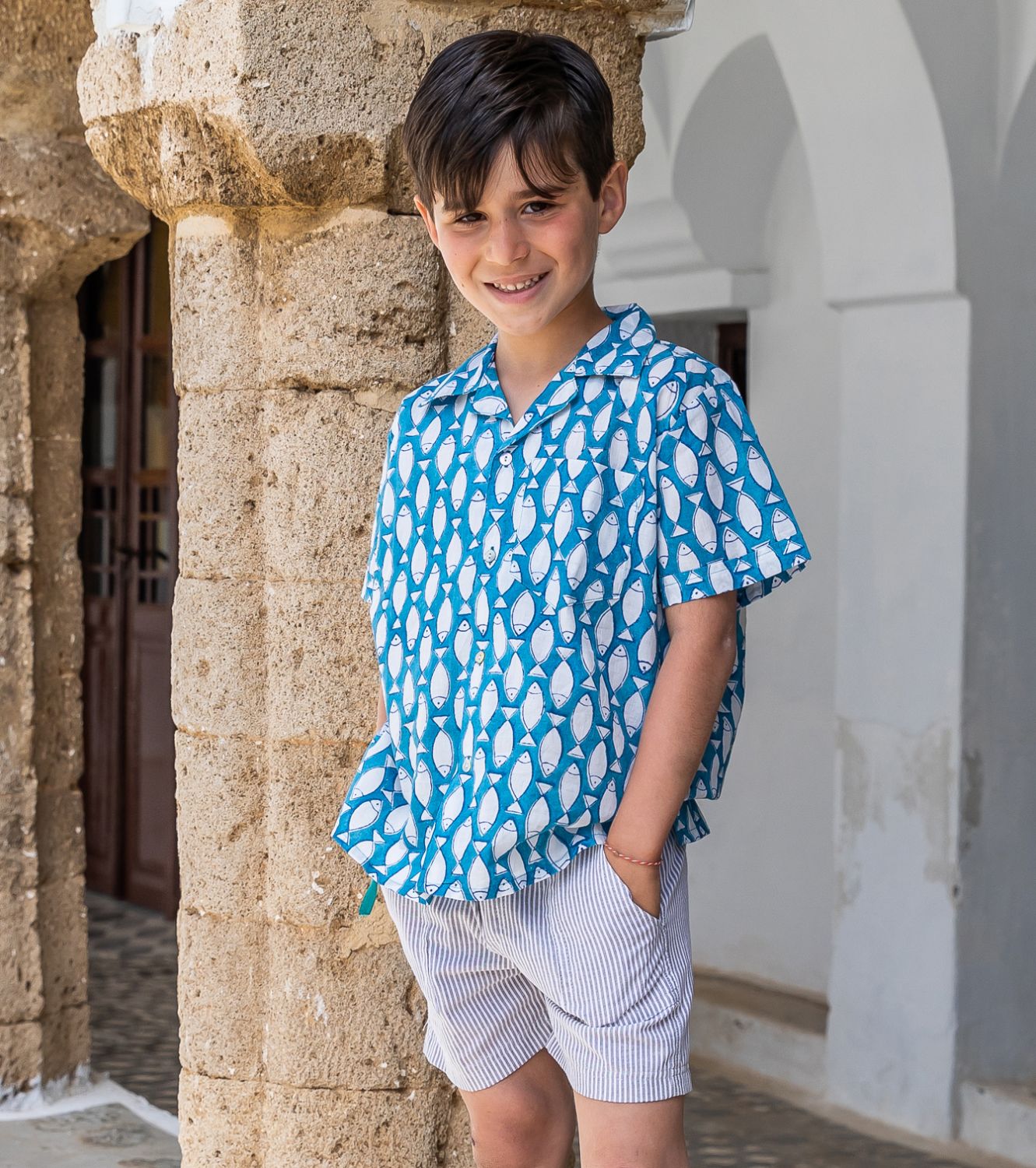 Handmade Fish print unisex summer shirt,100% cotton, made with natural colors. This lovely shirt for girls & your boyes offers a modern twist to a classic look whilst unbelievably soft and comfortable. Ideal for the warmer seasons.Unique designs with love & care.. Model: 4 years old.